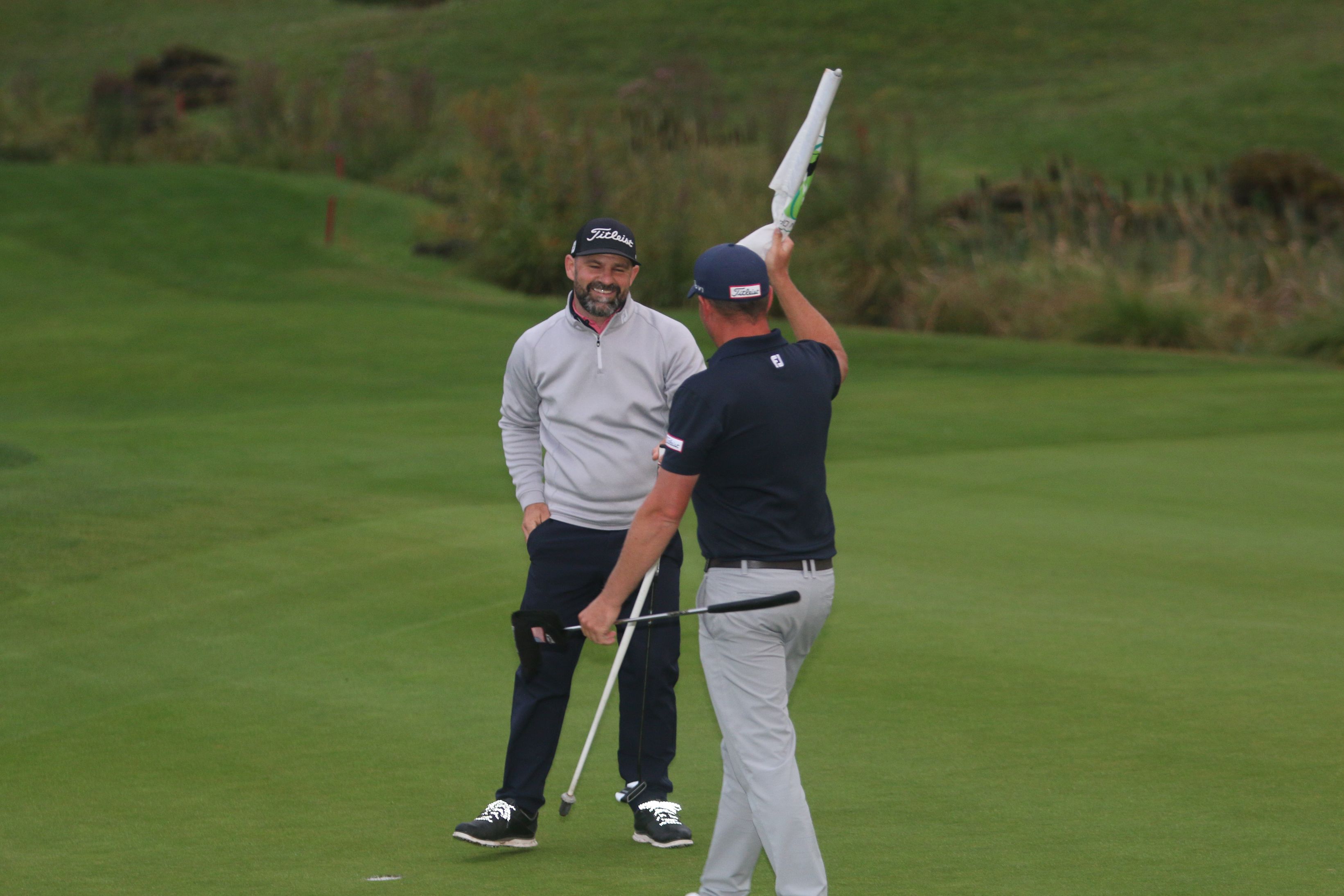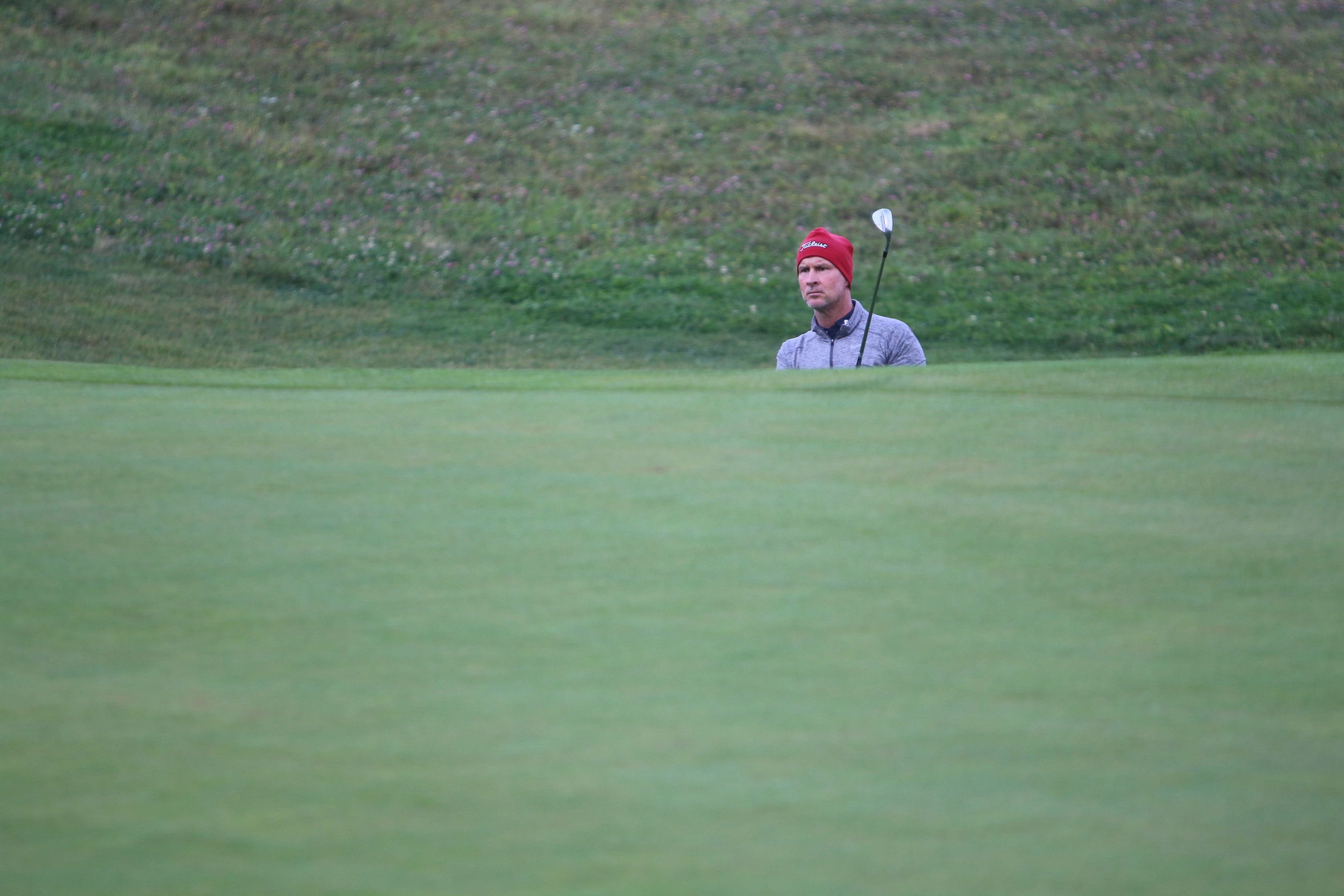 Küpper entscheidet sich gegen einen Free-Drop und eine daraus resultierende Hanglage im Rough, zieht sein Lobwedge voll auf dem Kiesweg durch und zeigt seine ganze spielerische Klasse: Der Ball stoppt einen knappen Meter neben der Fahne, das Par ist nach diesem Weltklasse-Schlag Formsache. Jahns erstklassiger Chip verfehlt das Loch denkbar knapp, und wie schon 2017 wird der Golflehrer des GC zur Vahr Deutscher Vizemeister, wie damals geschlagen von Dennis Küpper. „Nächstes Jahr werde ich wieder angreifen“, versichert Florian Jahn, „es wird Zeit, dass ich mir diesen Titel endlich hole.“