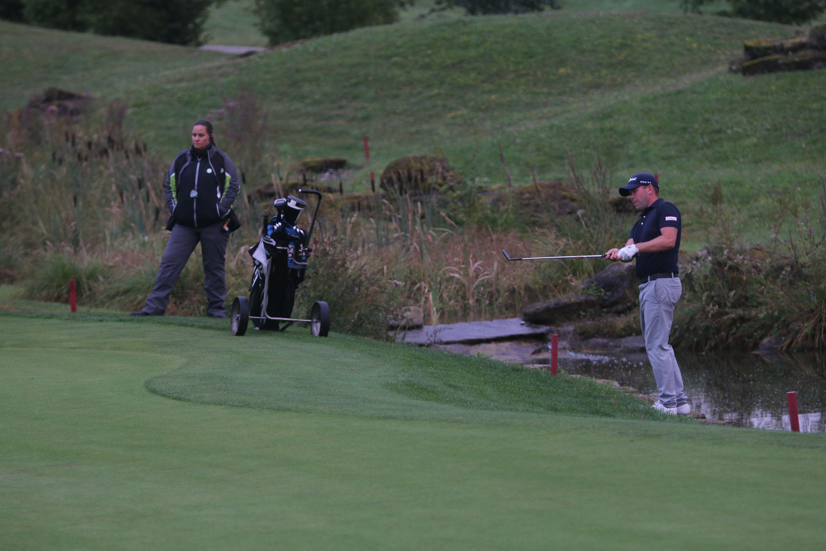 Turnierdirektor Andy Duck ruft nun Bahn 18 als erstes Extra-Loch auf, wo beide Kontrahenten das Birdie um Haaresbreite verpassen. Da die Abenddämmerung auf den Fairways des Niedersachsen Course am Hardenberg das Kommando übernimmt, beordert Duck die Duellanten auf den Abschlag von Bahn 9, ein 208 Meter langes Par 3. Küpper hat die Ehre und schlägt seinen Ball mit dem 4er-Eisen zwar Pin-high, aber rechts auf einen Kiesweg über dem Grün. Das Turnier scheint gelaufen für den Deutschen Golflehrermeister des Jahres 2017, damals hatte er am Scharmützelsee in Bad Saarow gewonnen. Die Fahne steckt von hier aus kurz, der Ball liegt schlecht. Doch Florian Jahn pullt seinen Abschlag nach links ins Wasserhindernis neben dem Grün. Alles wieder offen!