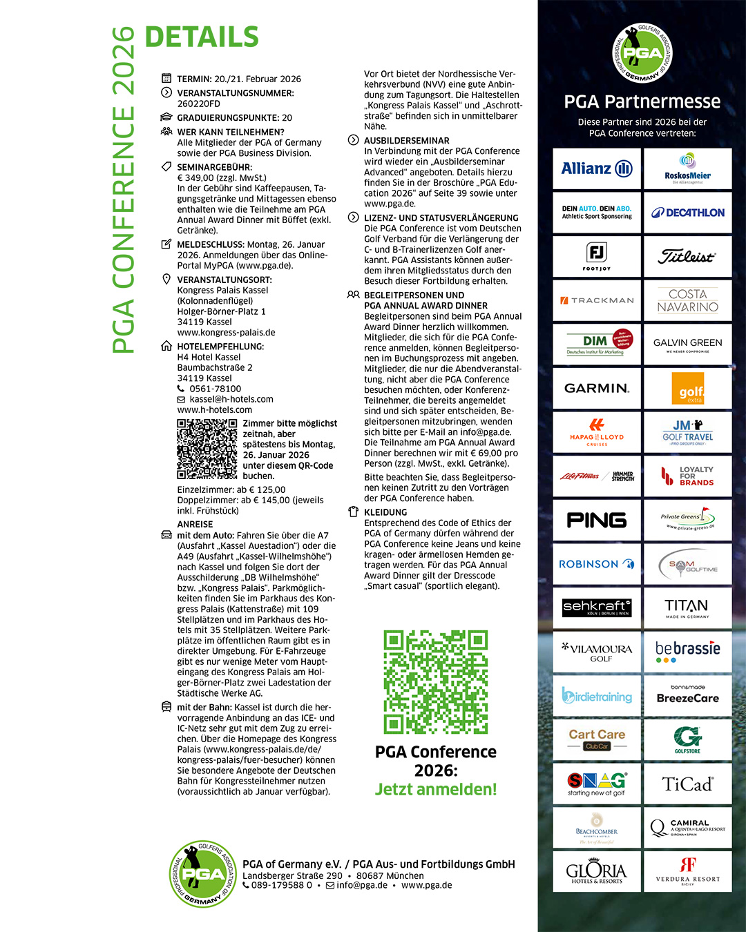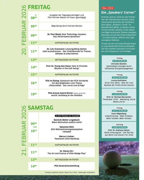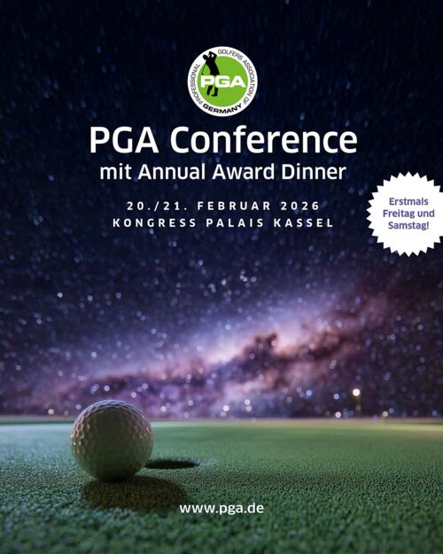 Die PGA Conference 2026 wirft ihre Schatten voraus: Am 20. und 21. Februar – erstmals an einem Freitag und einem Samstag – trifft sich die Golfbranche im Kongress Palais Kassel, um gemeinsam ins neue PGA-Jahr zu starten. Die Veranstaltung ist der traditionelle Jahresauftakt der PGA of Germany und bringt PGA Professionals, Teacher und Coaches, Player und Business-Experten der Golfbranche sowie die Partner des Berufsverbands und langjährige und künftige PGA Mitglieder mit einem umfangreichen PROGRAMM zusammen. Hier geht's direkt zur Anmeldung >>>
